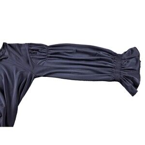 THIS ELEGANT ANN TAYLOR BLOUSE IN DEEP NAVY BLUE FEATURES STYLISH BELL SLEEVES WITH SOFT RUFFLED DETAILING AND A FLATTERING SCOOP NECKLINE. CRAFTED FROM A SMOOTH, STRETCHY KNIT FABRIC, IT COMBINES COMFORT WITH A SOPHISTICATED SILHOUETTEPERFECT FOR WORK, DINNER, OR CASUAL EVENINGS.