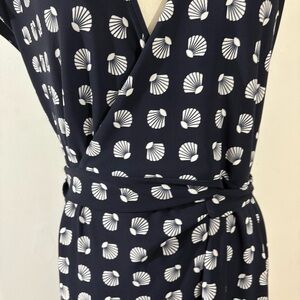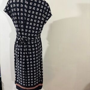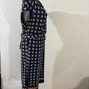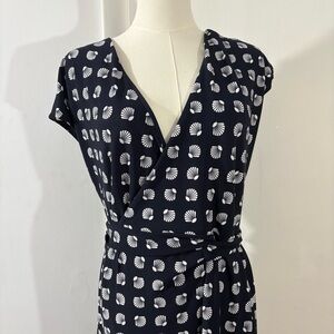 Elegant wrap dress with a navy base and white geometric pattern. Short sleeves and knee-length design. Perfect for casual or office wear.