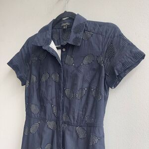 Ann Taylor Navy Eyelet Tennis Racket Button Up Collard Cotton Blend Dress Dress