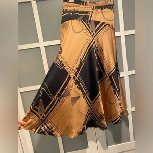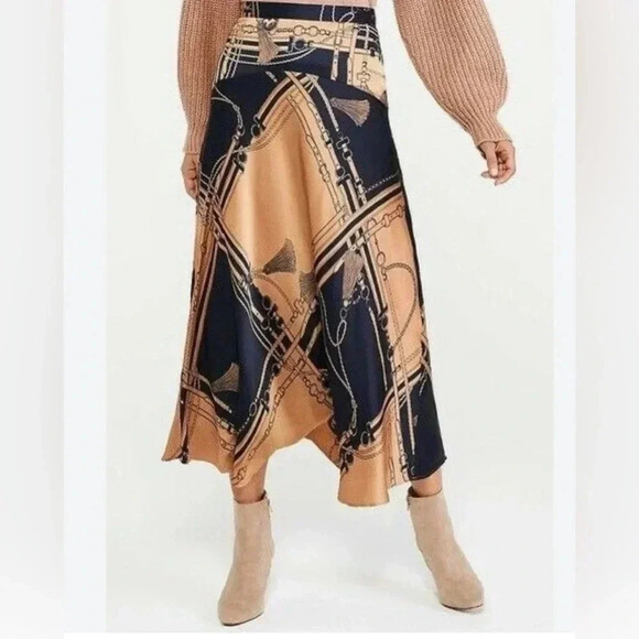 Ann Taylor Navy/Gold Equestrian Midi Silk Satin Feel A-Line Skirt Women’s 2 NWOT