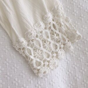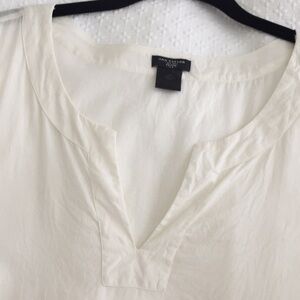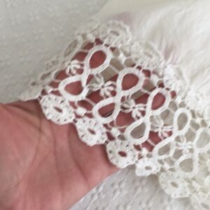 Ann Taylor Off-white Sheer Top with 3/4 Sleeves. Lace at end of sleeve and bottom border. Pair with nude camisole for the office. Used condition. Slight staining in underarm. Armpit to armpit 20 inches.
