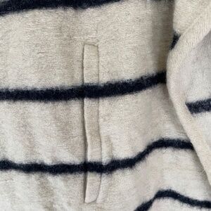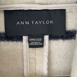 Ann Taylor poncho sweater | Ann Taylor open front cardigan | Ann Taylor knitted jacket | Ann Taylor striped coat | women’s wool blend sweater jacket | oversized cardigan poncho | beige black stripe sweater women | Ann Taylor one size sweater | fall winter outerw