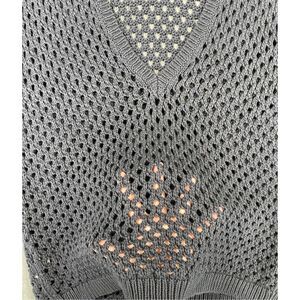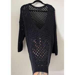 Lightweight and oversized open-knit sweater in black with a deep V neckline and relaxed fit. Labeled a size XL, ideal for wearing as a swim cover-up, layering piece, or casual boho-chic top. Soft and breathable with a versatile drape that flatters a range of body types. Great for beachwear, festivals, or cozy layering. Please see photos for measurements.