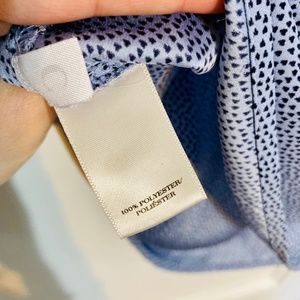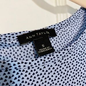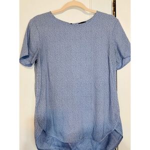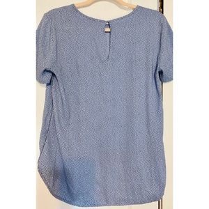 Light blue patterned blouse from Ann Taylor in excellent condition. Short sleeve blouse features a black speckled pattern throughout. Keyhole back.
