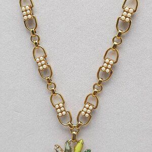Ann Taylor Pearl Cluster Pineapple Green Rhinestone Gold Tone Long Necklace