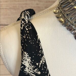 Black and white patterned dress perfect for any occasion. Twisted strap detail. Heavy jersey knit with plenty of stretch, bias cut with side ruching. Hidden side zip with hook and eye closure. Size ZERO PETIT, but because of the stretch I’ve found it can comfortably fit up to a size 2. Perfect condition, smoke free, pet free home.