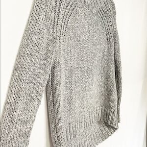 Chunky knit, light grey, 21% Wool. Nice heavy weight for colder weather. Excellent preowned condition, no rips stains or tears, no signs of wear. Measurements laying down