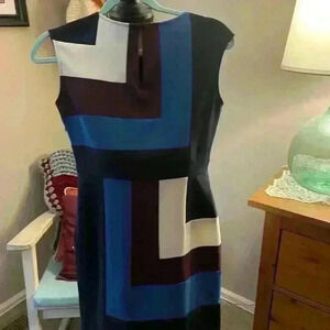NWT Ann Taylor Petite Dress. Navy, blue, purple and white. Has button hole closure in back of dress. SKU#180D
