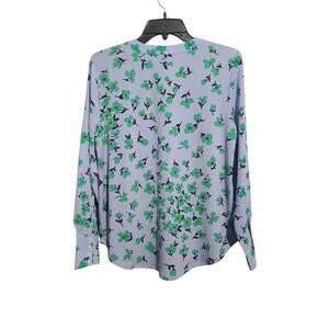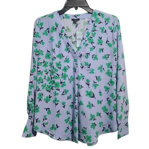 Description: Ann Taylor Petite Floral Mixed Media Pleat Front Top in Deep Wisteria, size SP, NWT. Features 100% polyester, blue with green flowers, clever pleated front for ease and fluidity, V-neck with pleat beneath, long sleeves with button cuffs, shirttail hem, woven front and sleeves, knit back, perfect for casual or stylish looks. Smoke-free home, fast shipping, bundle to save!
