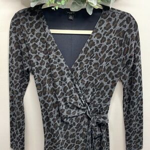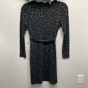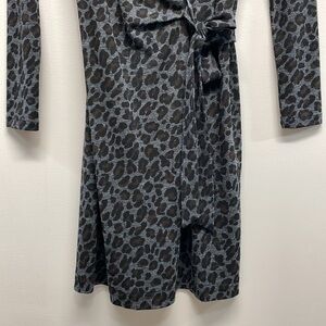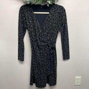 Ann Taylor Petite Gray Leopard Print Knit Wrap Dress in size XXSP. Excellent preowned condition. First photo is a stock photo. Faux wrap style crossover v-neck, gray, black and brown print, long sleeves, body is fully lined. Please see photos for approximate measurements and details. Item may show difference in color based upon photography and perception. Photos are part of the description, as everyone’s level of condition may vary. From smoke free and pet free home. All packages are shipped the same or next business day.