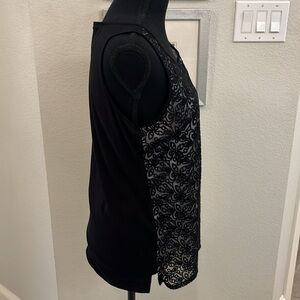 Ann Taylor Petite Medium - Black Sleeveless Sheer Embroidered Lace w White Lining In Front, and Plain soft stretchy shirt material in back. Tank Top Blouse in EUC. Says Petite, but it fits a regular too (what I always wear).