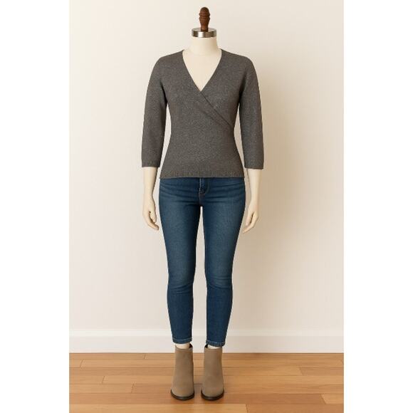 Ann Taylor Petite Small Metallic Gray Knit Wrap Sweater Button Cuff