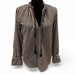 Ann Taylor Petite Stripe Tassel Blouse PM Ruffle Cuff Black White Vertical