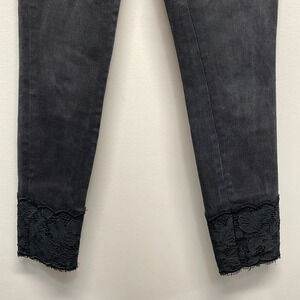 Ann Taylor Petite The Skinny Black Wash Denim Jeans with Lace Hem in size 2P. Excellent preowned condition. First photo is stock photo. Five pockets, zipper and button front closure, stretch denim, black lace detail on hem. Please see photos for approximate measurements and details. Item may show difference in color based upon photography and perception. Photos are part of the description, as everyone’s level of condition may vary. From smoke free and pet free home. All packages are shipped the same or next business day.