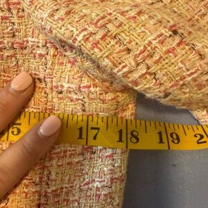 This Ann Taylor blazer combines elegance and style with its tailored fit and classic lapel collar. Crafted in a textured tweed, the pink and cream hues add a touch of sophistication to any outfit. Ideal for both professional and casual settings, this blazer is a versatile addition to your wardrobe.