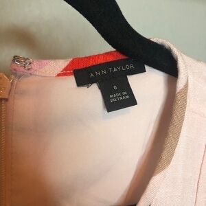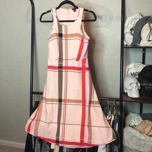 Size 0. Brown, black, gray, orange, red and white pattern horizontal and vertical stripes. Back zip. Sleeveless.