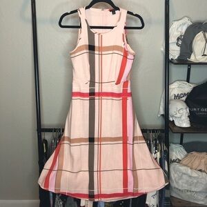 Size 0. Brown, black, gray, orange, red and white pattern horizontal and vertical stripes. Back zip. Sleeveless.