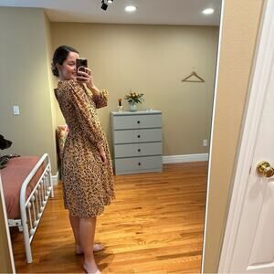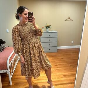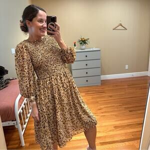 I adore this super pretty Ann Taylor pink animal printed smocked long sleeve midi dress