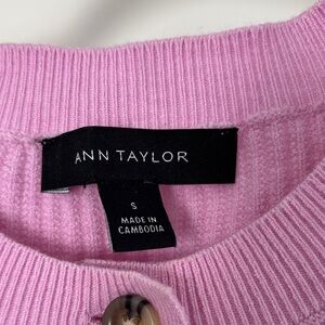 Chic pink sweater with button-up front. Ribbed texture. Long sleeves. Perfect for layering. This is a really cute lightweight cardigan that is slightly cropped. But it’s not annoyingly short. I think it’s just right for a cropped cardigan. I’m selling because the pinkish purple color does not do well with my skin tone. I’ve only worn this about five times.