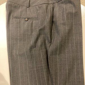 Straight leg pinstripe pants (light pink & beige stripes) on a gray background. Excellent condition. Only flaw is fraying on the inside tags (see pics). Smoke free home.