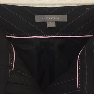 A classically-tailored pant with beautiful drape from Ann Taylor. Very subtle pinkish-lavender pinstripe adds a nice detail. Signature fit (sits just below natural waist and relaxed through hip & thigh). Size: 6. Color: Black with pinkish-lavender pinstripe. Excellent condition.