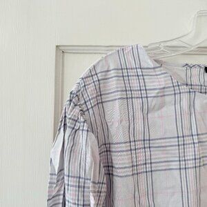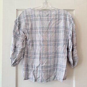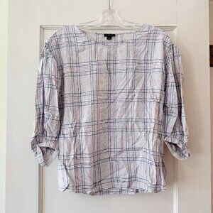 Lined up in timeless plaid, this airy light top features balloon sleeves for a fresh and feminine finish. Round neck. 3/4 sleeves. Drop shoulders. Side slits.