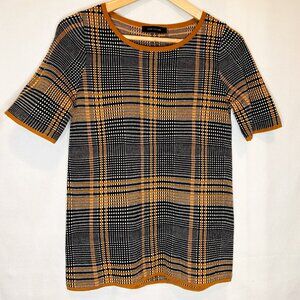 Shift into neutral with this plaid sweater, patterned in a warm palette of rich caramel and smoky grey. Note - No size tag, but estimating a Medium. See measurements for details. Garment is used, but still in great condition!