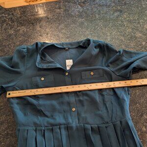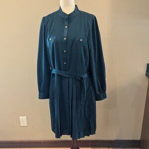 This belted flare dress pairs a split neck top with a crisply pleated skirt, for a look that reads pretty and polished. Split neck. Long sleeves with shirred sleeve caps and button cuffs. Button front placket. Chest welt button pockets. Self tie buckle belt. Hidden side zipper. Lined body. 100% Polyester. Machine Washable.
