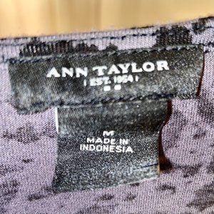Ann Taylor Purple Cheetah 3/4 Sleeves featuring a surplice neckline followed by a lower rib level babydoll seam around. The front has a ruched band that gathers the eye giving a very flattening effect. Although this print is on the wild side with cheetah, the muted purple background makes it more subtle design. Dress it up with a bold color jacket for an evening now, or put with a basic pencil skirt and wear it in an office setting. (The black slip tank not included.)