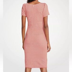 Chic and effortless, this Ann Taylor red and white striped dress is perfect for work, brunch, or summer events. Designed with subtle puff sleeves for a feminine touch, it features a flattering sheath silhouette, a hidden back zipper for a clean finish, and a soft, stretchy rayon blend for all-day comfort.