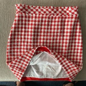 Stylish red and white checkered tweed pencil skirt perfect for any occasion. Lined. Add a pop of color to your wardrobe with this chic design.raw edge waistband and detailing. Zips up back.
