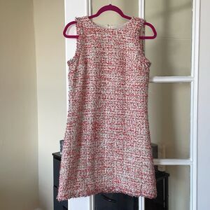 Chic tweed mini dress. Sleeveless design. Perfect for any occasion.