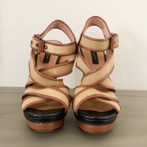 Ann Taylor Rosemary Canvas Platform Sandals. Size 8.5M. Color: Forest Moss. Some discoloration on the canvas, may come out with cleaning. Wooden high heels. Leather soles and trim. Ankle straps. Heel measures 5.25” from the Tom of back of the shoe to the bottom of the heel.