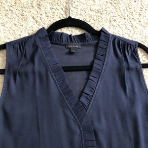 This navy blue sleeveless top has a cute ruffle trim lining the v-shaped neckline and running down the front of the blouse. Made of lightweight crepe-like material. Hardly worn. Size S.