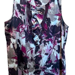 This stylish blouse from Ann Taylor showcases a beautiful blend of purple and pink tones, complemented by elegant ruffled details. Its artistic design adds a modern touch, making it a perfect statement piece for any occasion. Ruffle front slip top. Sleeveless. Small darts in back from hem for slight fitted effect. 97% polyester 3% spandex. Size 14. Colors: mauve, pink, beige, ivory. Pet free smoke free environment.