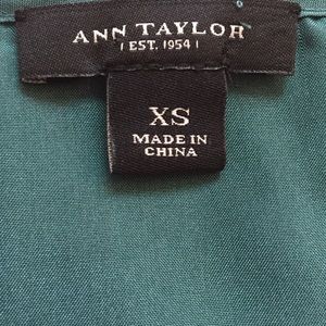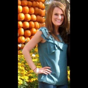 Gently worn. Green silk ruffled neck blouse. Very versatile--wear it with jeans or pair it with a pencil skirt and heels for work. There are a few very light specks on the front (shown), but not at all noticeable unless you are looking closely. Dry clean only.