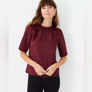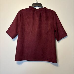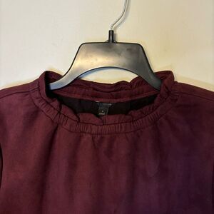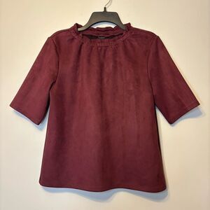 Ann Taylor SZ Medium Faux Suede Ruffle Neck Top in Smoked Garnet Preppy Career