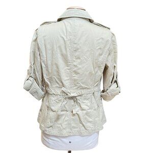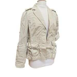 Stylish and functional, this beige safari jacket from Ann Taylor Loft is designed for a versatile look. With medium fit and practical drawstring waist.