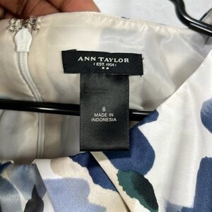 This Ann Taylor dress showcases a striking abstract print in black and blue, designed in a chic sheath style. The sleeveless mini dress features a sophisticated halter neckline, making it perfect for cocktail events or a stylish day at work. Its modern artistic pattern adds a unique touch to its elegant silhouette.