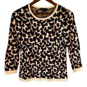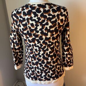 Ann Taylor Animal Print Sweater. Size Small. 3/4 L sleeve, scoopneck. Cream hems and wrists. Dark navy blue and brown print in cream. Perfect layering piece. Office, casual,comfy. 30% wool. Supersoft. Flat lay 25” L 17” P-P.