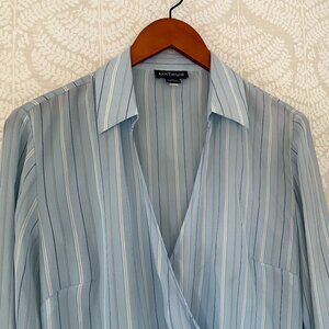 Ann Taylor Semi Sheer Blue, Ivory, Tan Silk Collared Surplice Wrap Blouse, 10