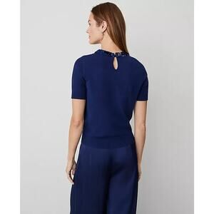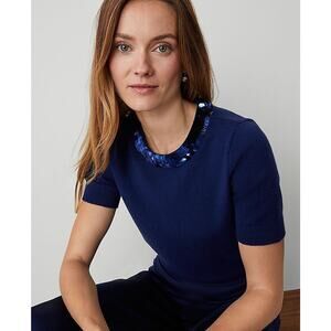 Ann Taylor Sequin Neck Short Sleeve Sweater Deep Ocean - M
