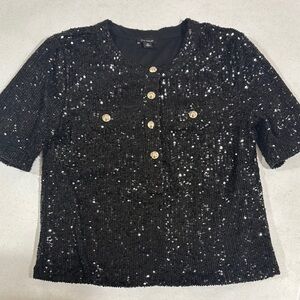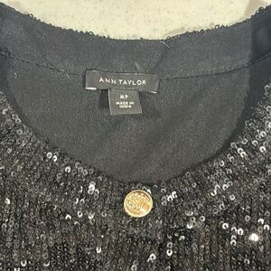 Ann Taylor Sequins Henley Blouse Black Medium Petite with Gold Buttons