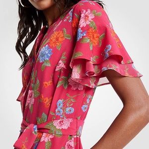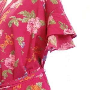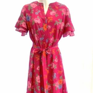 Ann Taylor Short Sleeve Dress Floral Print Flutter Sleeve Magenta Pink with multicolored flowers, Mid Length, Belted, 100% polyester