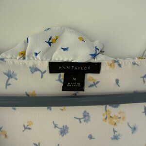 Ann Taylor Poly/Spandex short sleeve top. Sleeve openings are finsihed with elastic. Ruffle around neckline. Mock Raglan with buttons. Peplum top. White with blue & yellow flowers.