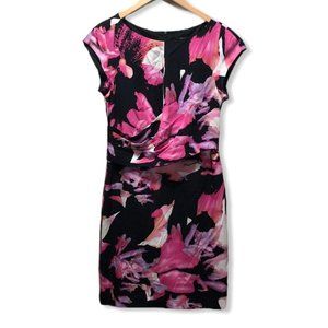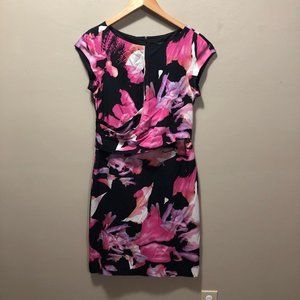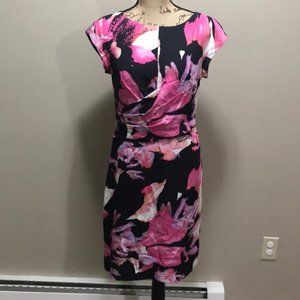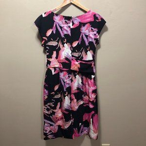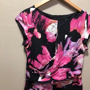 Ann Taylor Silk black and pink floral sheath dress. Gathered in the mid section. Short sleeve. Lined.