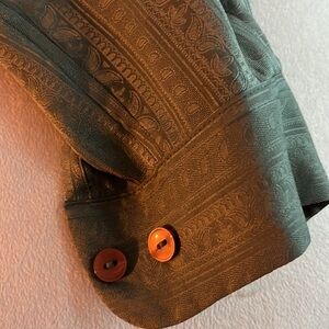 This beautiful sage green etched 100% silk blouse with all original buttons (plus 3 included extras) is genuinely one of the most gorgeous show stopping articles of clothing I’ve ever seen. The size is marked P, I assume for petite but it fits like a normal women’s small, just with a little shorter arms. This 100% silk blouse is one of a kind and needs a new rightful owner!❤️