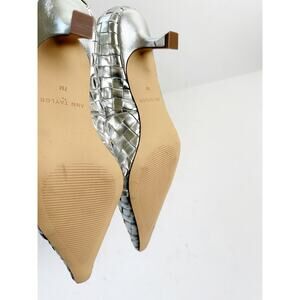 Step out in style with these elegant Ann Taylor kitten heel pumps! These silver weaved pointed-toe heels are perfect for adding a touch of sophistication to your work or weekend outfits. The padded footbed ensures all-day comfort.