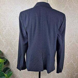 This dark navy blue blazer is perfect business or career wear. classic tailoring with the notched lapels and 1 button closure. There is 1 chest pocket and 2 flap pockets on the front that are all still sewn shut. The long sleeves end with 4 decorative buttons at the cuffs. Back vent for ease of movement. Fully lined. Extra buttons included. Pairs well with trousers, jeans, skirts or dresses.