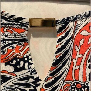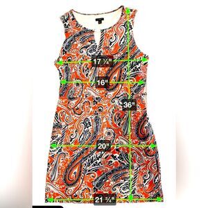 Elevate your wardrobe with this Ann Taylor Sheath Dress, a perfect blend of sophistication and style for any business event or cocktail party. This knee-length dress boasts a vibrant multicolor paisley pattern that adds a touch of playful elegance to your look. The tailored silhouette is designed to flatter, ensuring you feel confident and chic. A unique gold-tone bar detail at the neckline provides a luxurious accent, making accessorizing effortless. Lined. This pre-owned dress is flawless and comes from a smoke-free, dog-friendly home, ready to make a statement at your next special occasion.